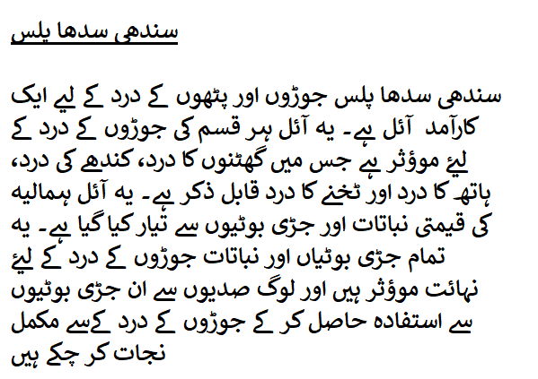 سندھی سدھا پلس جوڑوں اور پٹھوں کے درد کے لیے ایک کارآمد آئل ہے۔ یہ آئل ہر قسم کی جوڑوں کے درد کے لیۓ موؤثر ہے جس میں گھٹنوں کا درد، کندھے کی درد، ہاتھ کا درد اور ٹخنے کا درد قابل ذکر ہے۔ یہ آئل ہمالیہ کی قیمتی نباتات اور جڑی بوٹیوں سے تیار کیا گیا ہے۔ یہ تمام جڑی بوٹیاں اور نباتات جوڑوں کے درد کے لیۓ نہائت موؤثر ہیں اور لوگ صدیوں سے ان جڑی بوٹیوں سے استفادہ حاصل کر کے جوڑوں کے درد کےسے مکمل نجات کر چکے ہیں